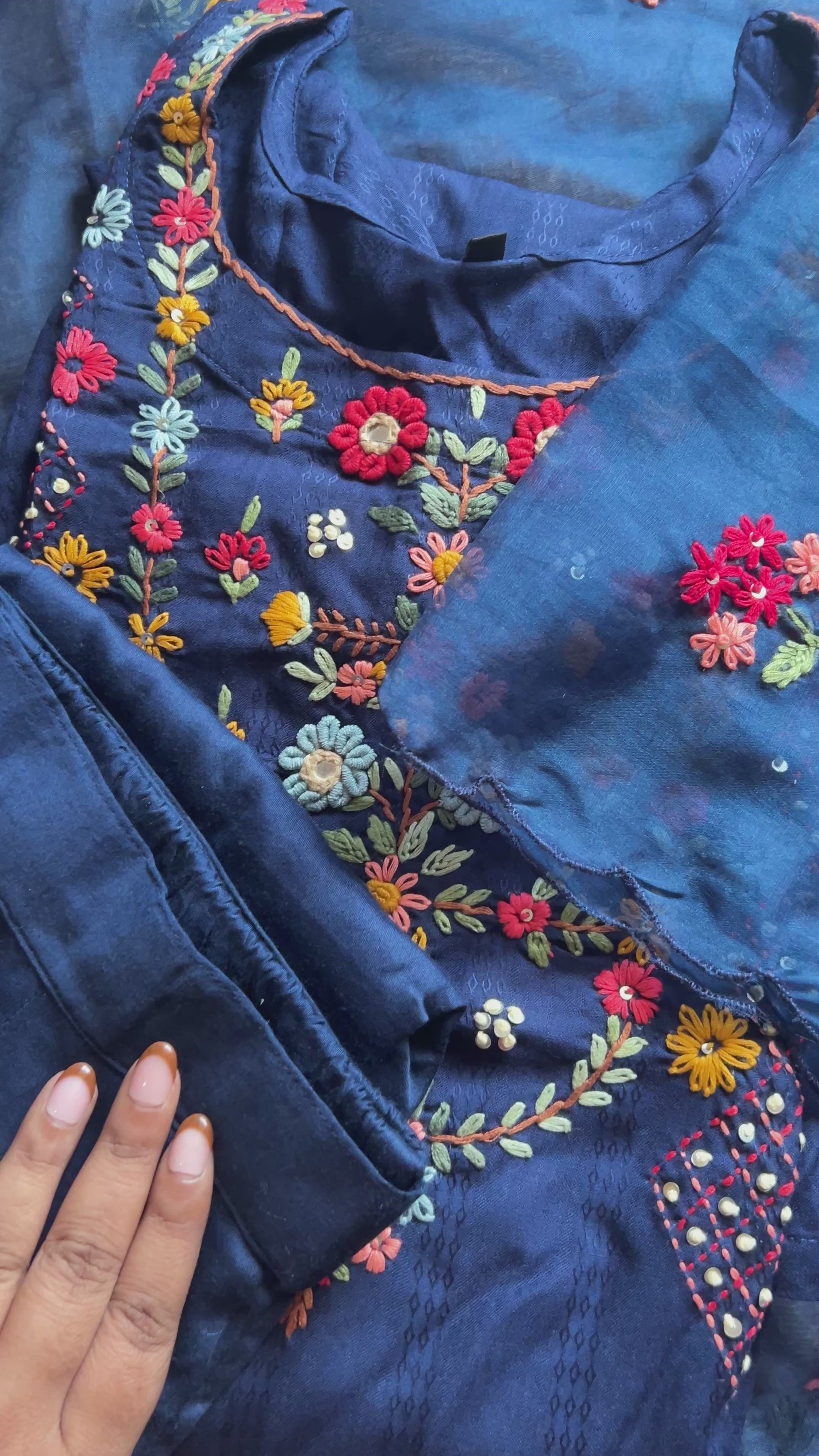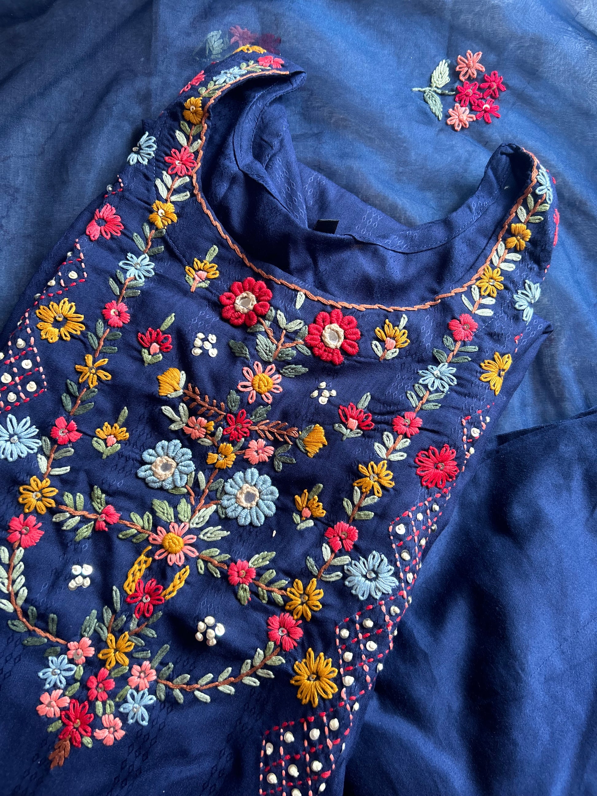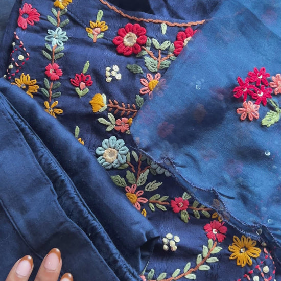 Blue katha work suit set with organza dupatta
