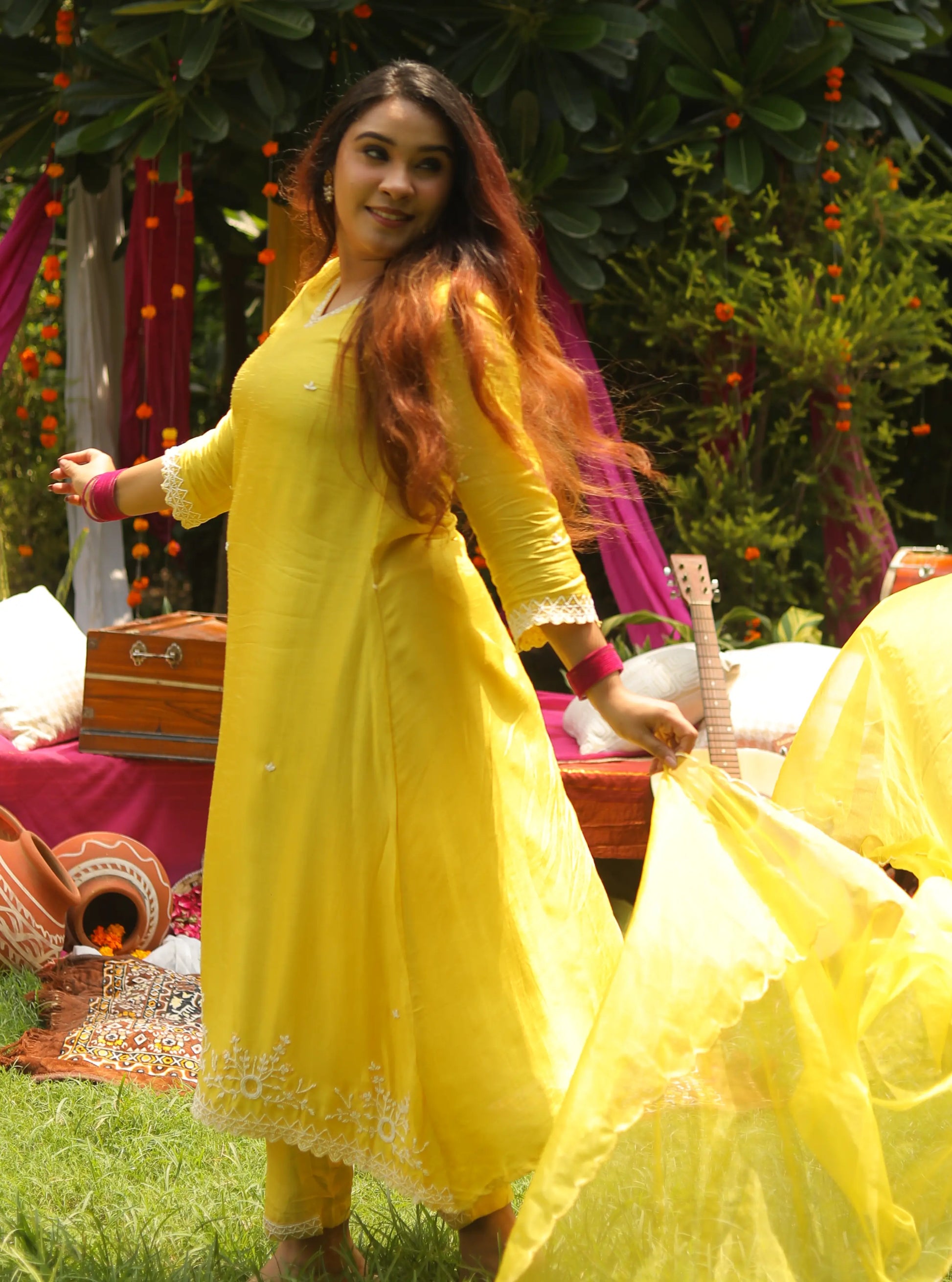 Ziya Yellow Dola Silk Suit Set with Organza Dupatta & Pearl Cutwork Detailing